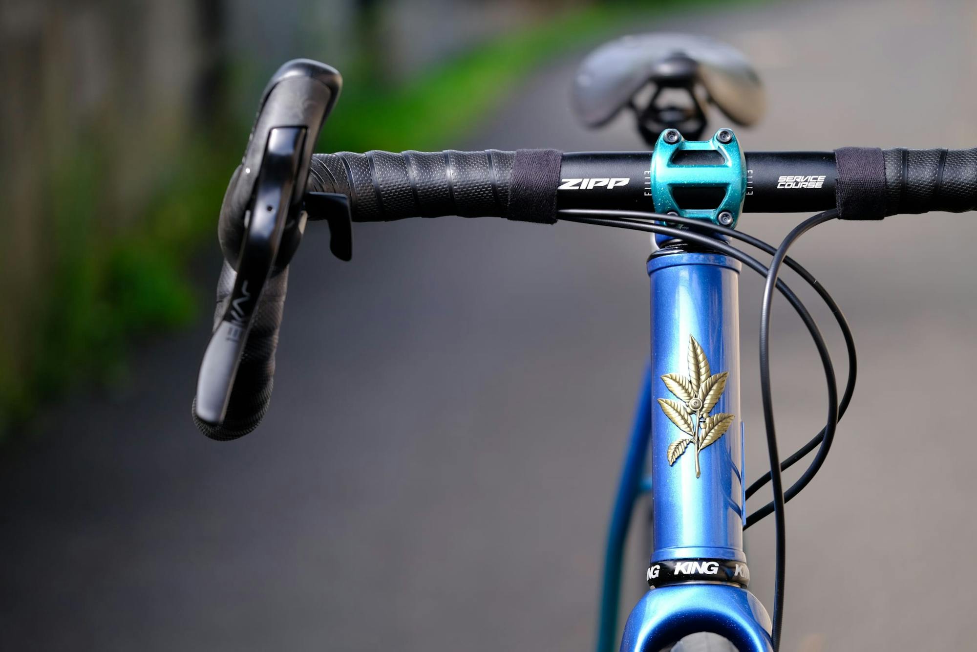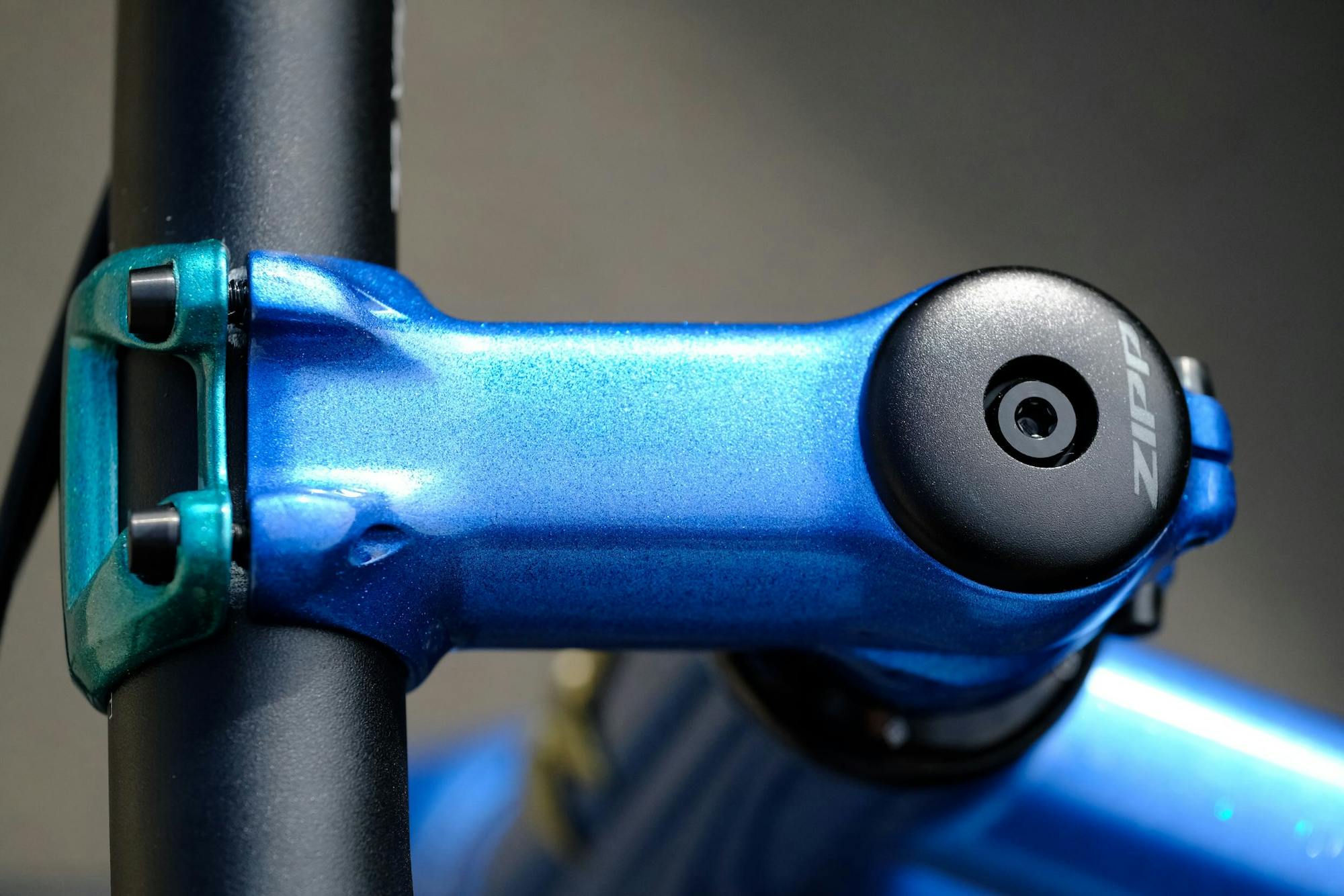 The cockpit is equipped with Zipp stem and handlebars. The stem has been painted to match the rest of the bike.