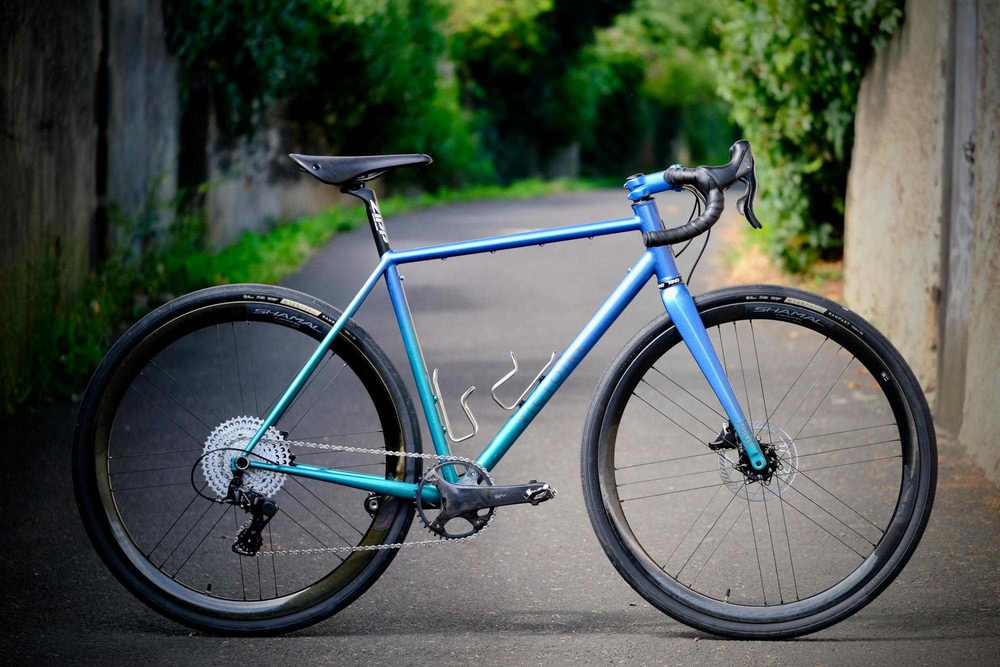 Benjamin lives in Haute-Savoie, near Switzerland. Between mountains and lakes, he wanted a bike that could take him both on long road outings and on forest paths, as the region is full of unpaved trails. To climb the region's many mountain passes, Benjamin needed a versatile configuration that could handle both steep hills and twisty, technical descents. Already a mountain bike owner, he contacted us to build his dream bike, a perfect illustration of the all-road bike sought by adventurous cyclists.