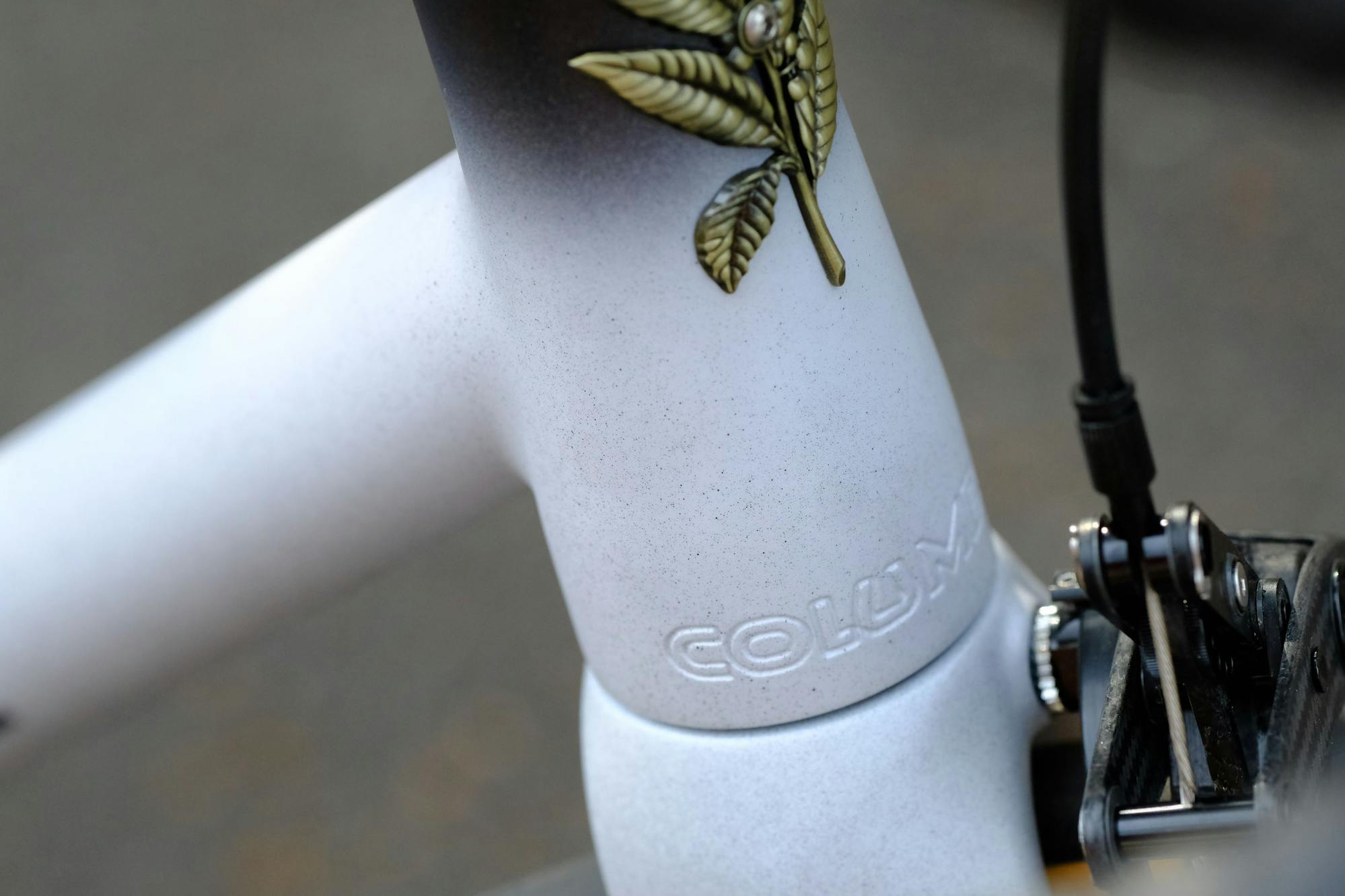 La peinture du vélo de François a été réalisée dans notre atelier, à Beaumont : nous avons associé un gris très clair à un autre très foncé, presque noir. Ils se rencontrent en dégradé ainsi qu'en masquage au niveau de la partie raccord du Cento, là où se situe la Colombe. Le gris clair reçoit également un très léger mouchage gris foncé pour lier un peu plus les deux couleurs.