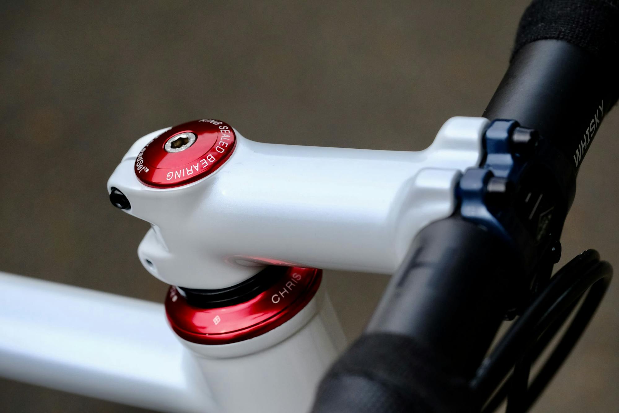 Impressed by the elegant look of white Victoire bikes, David wanted this paint color for his bike. We suggested a soft color gradient from an off-white - that we really like at Victoire - to a blue grey. This is intensified by the night blue logos that highlight the red anodized accessories.