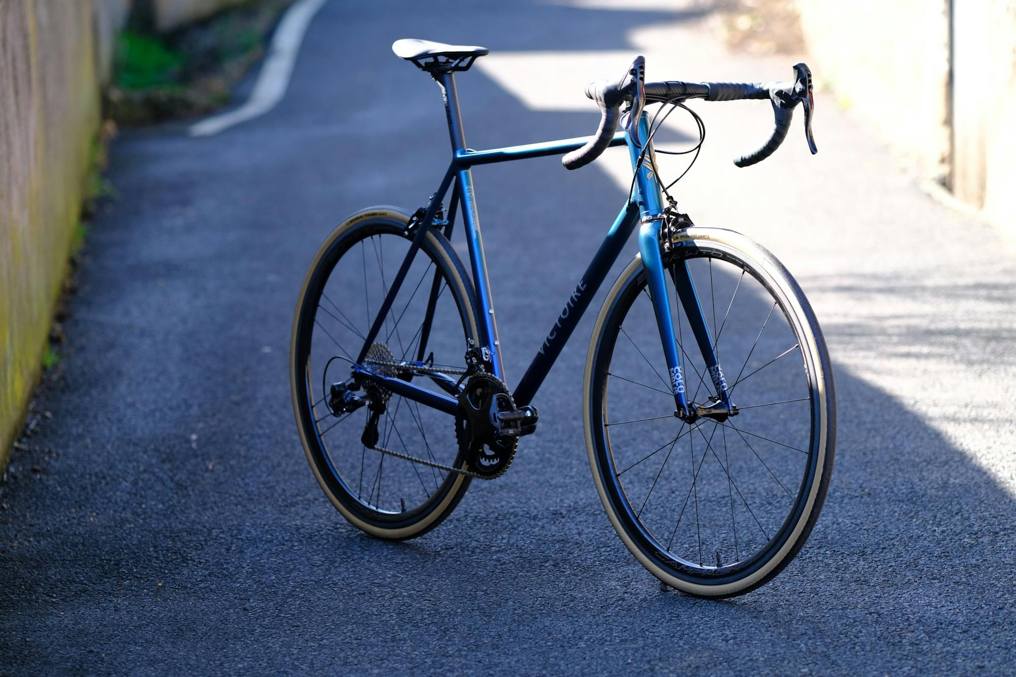 We painted this sober, elegant bike in a gradient of two deep metallic blues. The Victoire and Columbus logos and our gold medallion on the head tube are highlighted by contrast.
