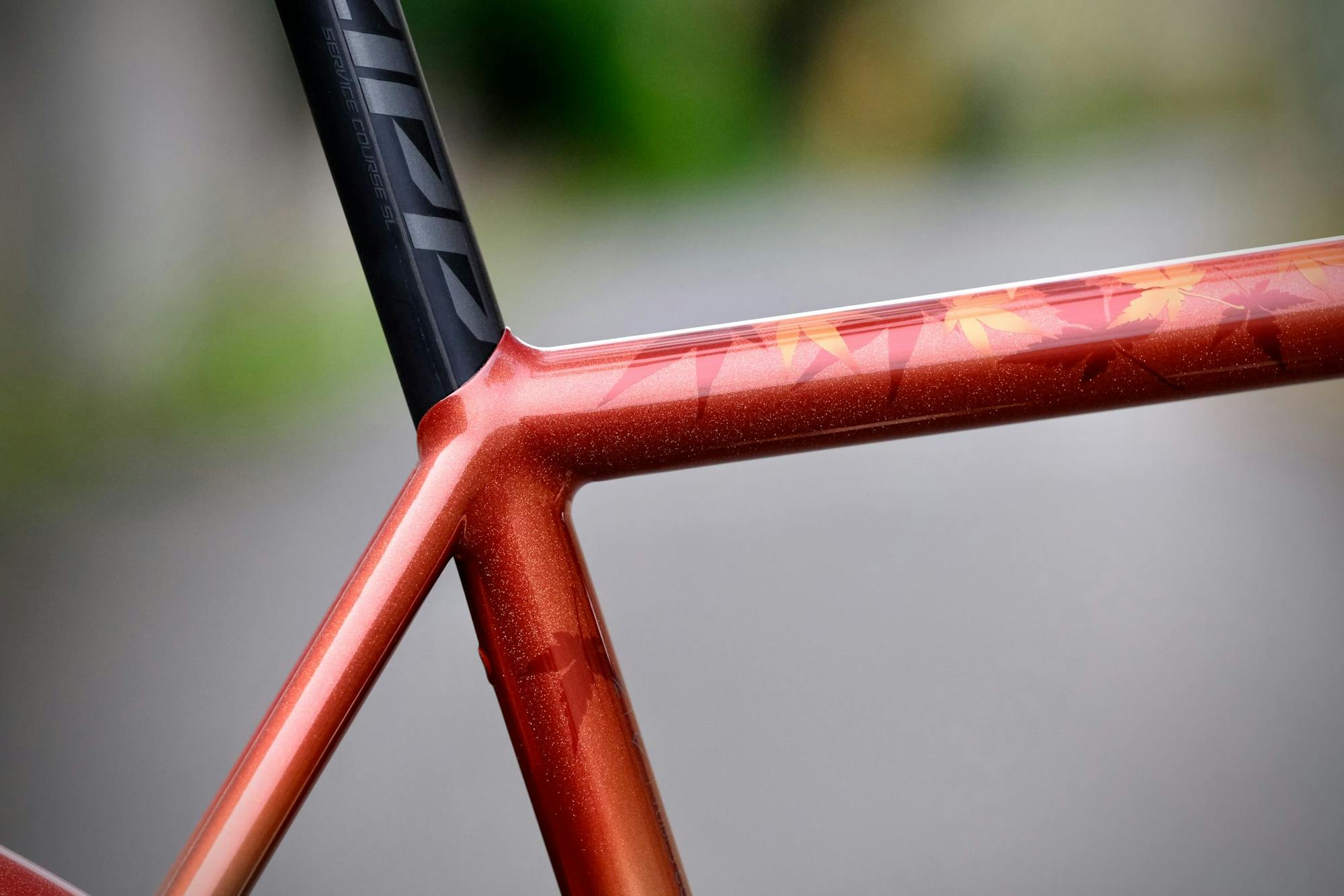 Michel wanted an orange hue for his bike, but gave us carte blanche for the paint details. It was a trip to Japan that inspired us. In autumn, maple leaves turn red, giving the Japanese forests an orange-red monochrome appearance. We applied leaf motifs in a variety of autumnal colors to a glittery background.