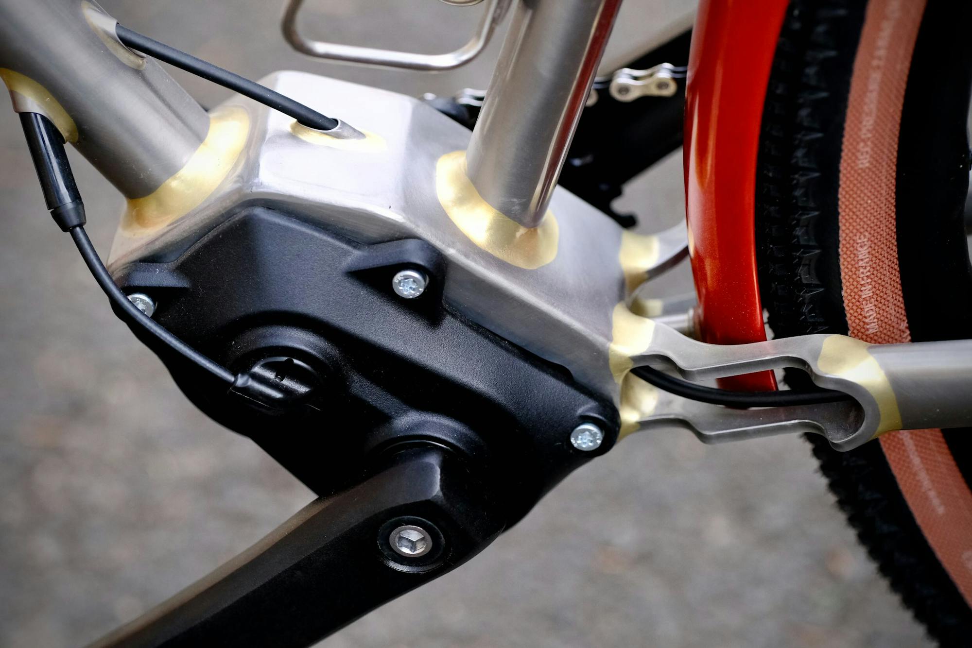 As the stainless steel frame allows the weld seams to remain visible, we created a gradient towards a transparent varnish in the crankset area. This highlights Mathieu's craftsmanship around the area that houses the gearbox and the rear hub. The chainstays are joined to the gearbox by an intermediate piece: the yoke. We felt this was the most aesthetically pleasing technical solution for this exceptional bike.