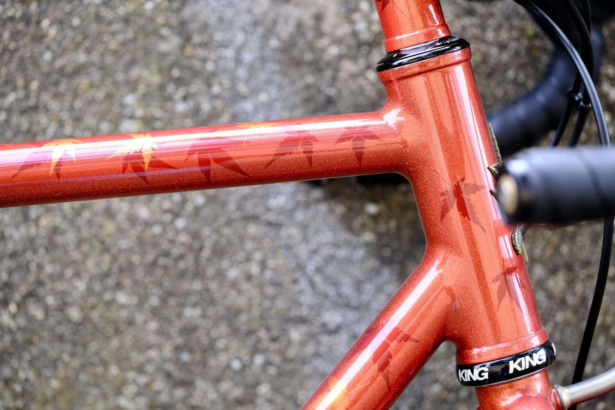 The first thing that strikes you about the bike is its appearance. The paintwork is splendid and far exceeds what I had imagined. The glitter is magnificent in natural light, and the maple leaves are ideal for outings in the woods. I find it hard to look ahead while riding, regularly catching myself staring at the frame! Ride comfort is top-notch. I quickly got used to the way the gearbox works: you pedal steadily towards the harder gears, while the easier gears only engage when you release the pressure on the pedals. This makes it possible to "go up several teeth" at once by pre-selecting several gears before releasing the pedal for half a second on the way up. It comes fairly quickly. In terms of development, for the moment I have a 1 ratio between front and rear, so I'm using the Effigear gearbox as it is. I'll give myself a few months to see if I can increase the number of teeth at the rear a bit, but so far I've never had to force myself too much when climbing. Both in terms of aesthetics and uniqueness, I'm very happy to have entrusted Victoire with the realization of my project!