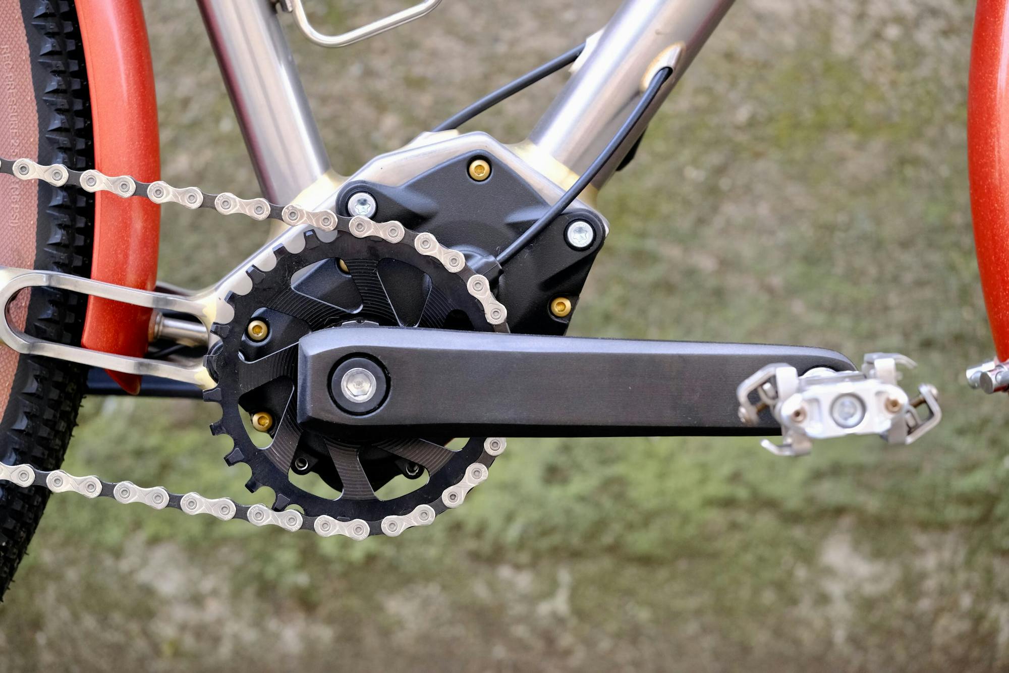 As the stainless steel frame allows the weld seams to remain visible, we created a gradient towards a transparent varnish in the crankset area. This highlights Mathieu's craftsmanship around the area that houses the gearbox and the rear hub. The chainstays are joined to the gearbox by an intermediate piece: the yoke. We felt this was the most aesthetically pleasing technical solution for this exceptional bike.