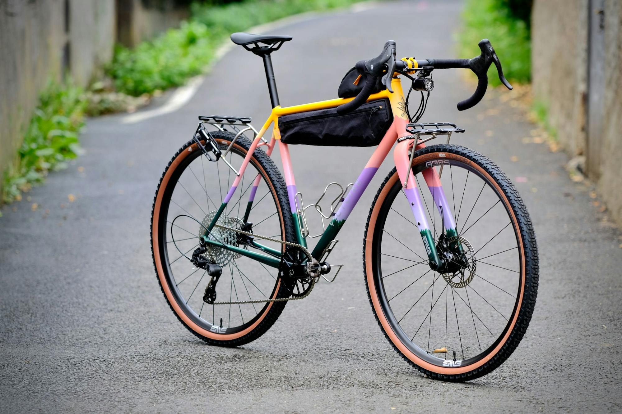 The comfort is just insane! I feel like it’s even comfier than my carbon Gravel with 45mm tyres. The Enve wheels are really pleasant and make the bike very stable. The weight distribution is great—you’re perfectly positioned on it. The rear panniers disappear straight away thanks to your removable rack system. There’s no wobble from side to side when you ride out of the saddle.