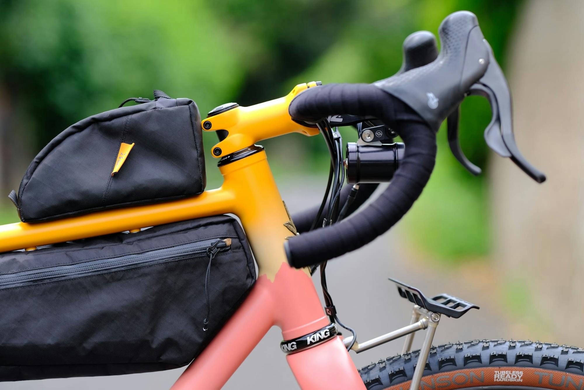 In addition to the racks for panniers, we equipped the frame with WhatHappened bags, handmade in Slovenia. These small bags let Julien store snacks, tools, a light jacket, or anything else he might need quickly during a ride.