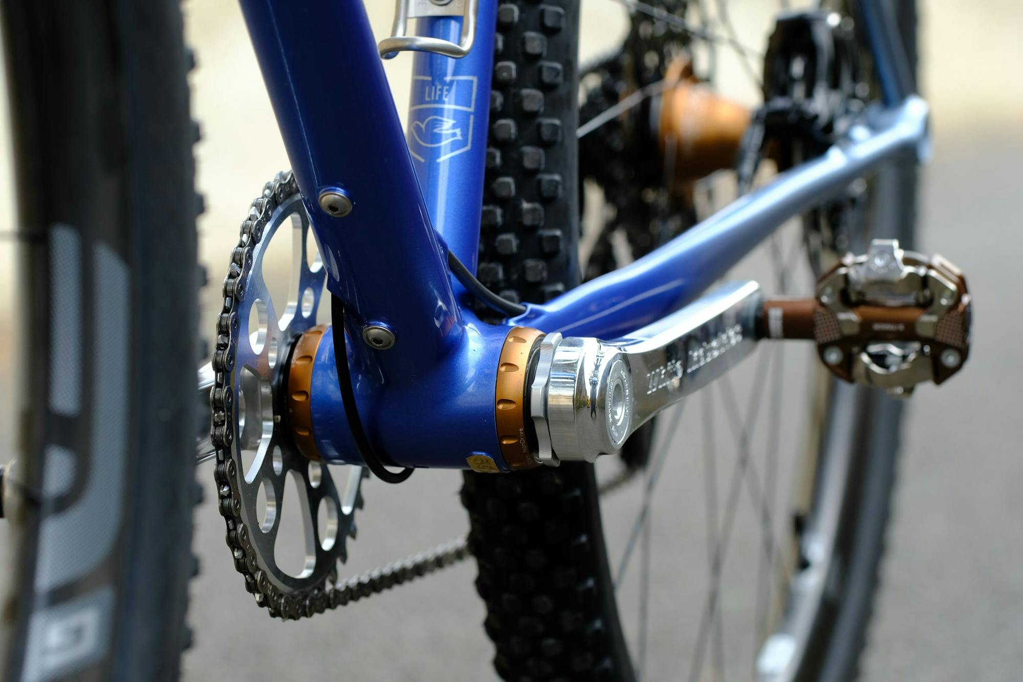 The Chris King Threadfit 30x bottom bracket houses a crankset from yet another American brand: White Industries. Romain rightfully opted for a polished aluminum finish, as unlike other colors it will not wear out with shoe rub and mud (a common problem on bikes used off-road). The polished crankset also echoes the paintwork on the rear triangle.