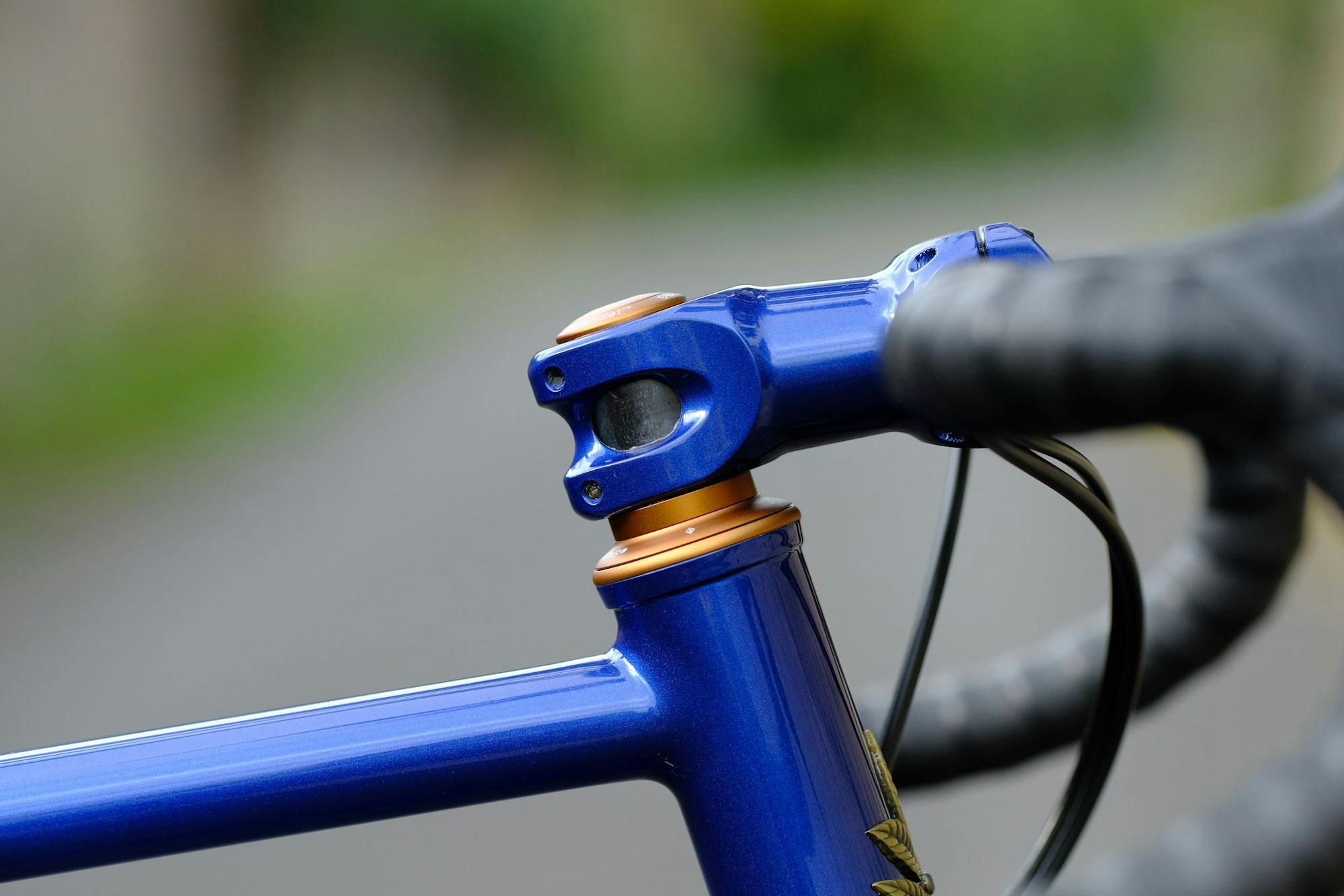 Like all Victoire bikes featuring our new brand identity, #459 was painted at our shop. Romain wanted something subtle and slightly iridescent. So we created a progressive triple fade, going from an intense blue to a very light gray-blue. This last color was also used for the logos, and all three colors were chosen to complement the bourbon finish of the Chris King components. The paint received two layers of clear coat, and was then polished carefully in order to obtain a high gloss finish.