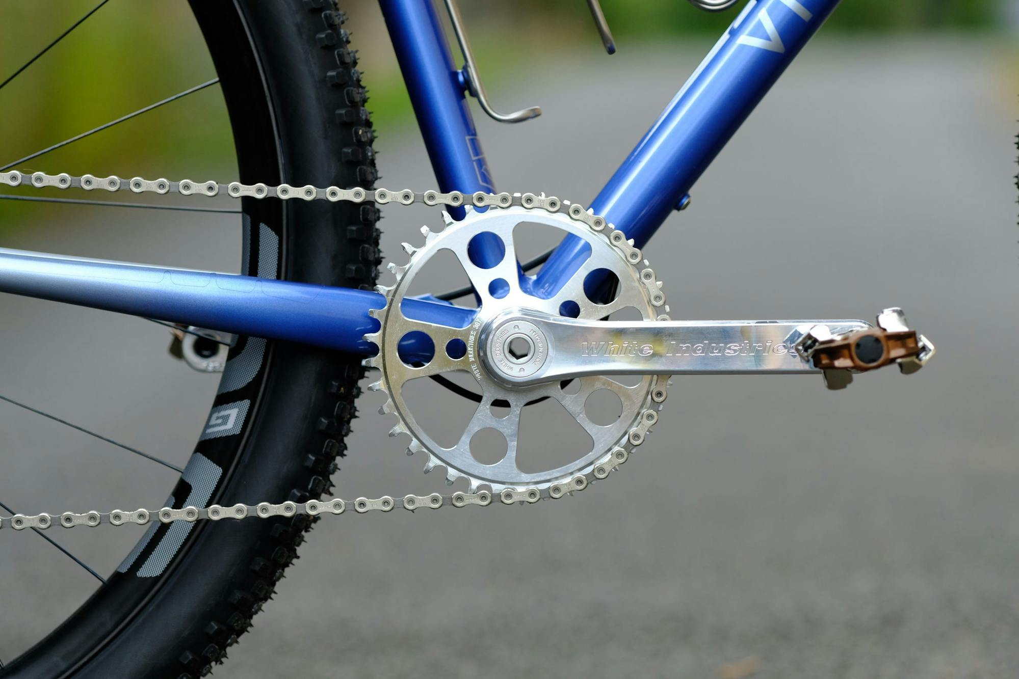 The Chris King Threadfit 30x bottom bracket houses a crankset from yet another American brand: White Industries. Romain rightfully opted for a polished aluminum finish, as unlike other colors it will not wear out with shoe rub and mud (a common problem on bikes used off-road). The polished crankset also echoes the paintwork on the rear triangle.