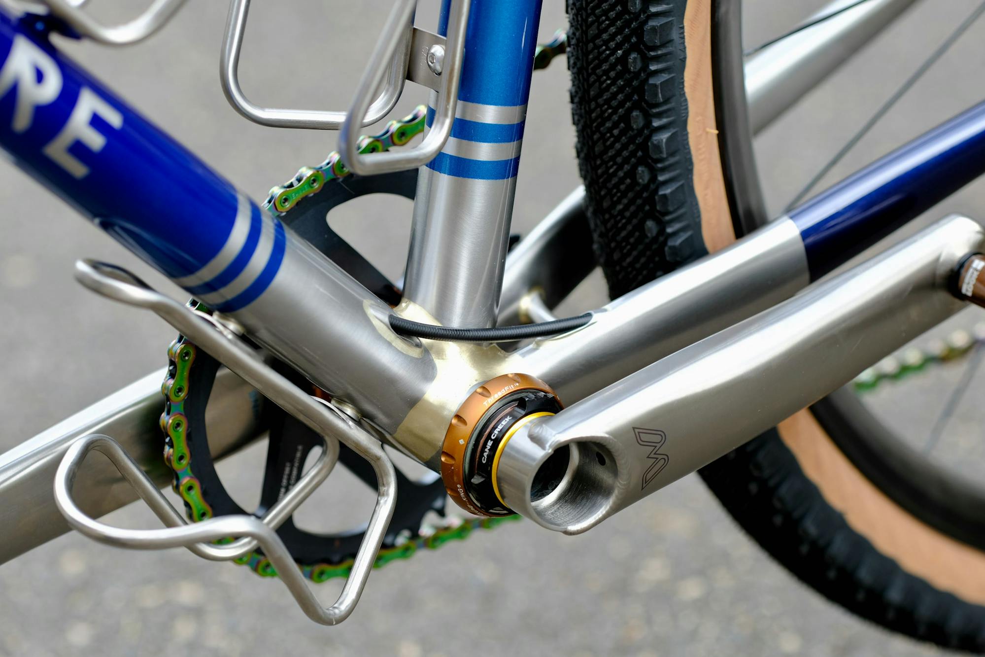 Entre les deux nouveaux coloris de pièces Chris King proposés, violet ou bourbon, nous avons préféré le second. La peinture a été choisie en fonction, avec un triple dégradé de bleu métallisé, entrecoupé de parties brutes laissant apparaitre le travail sur les parties en inox.
