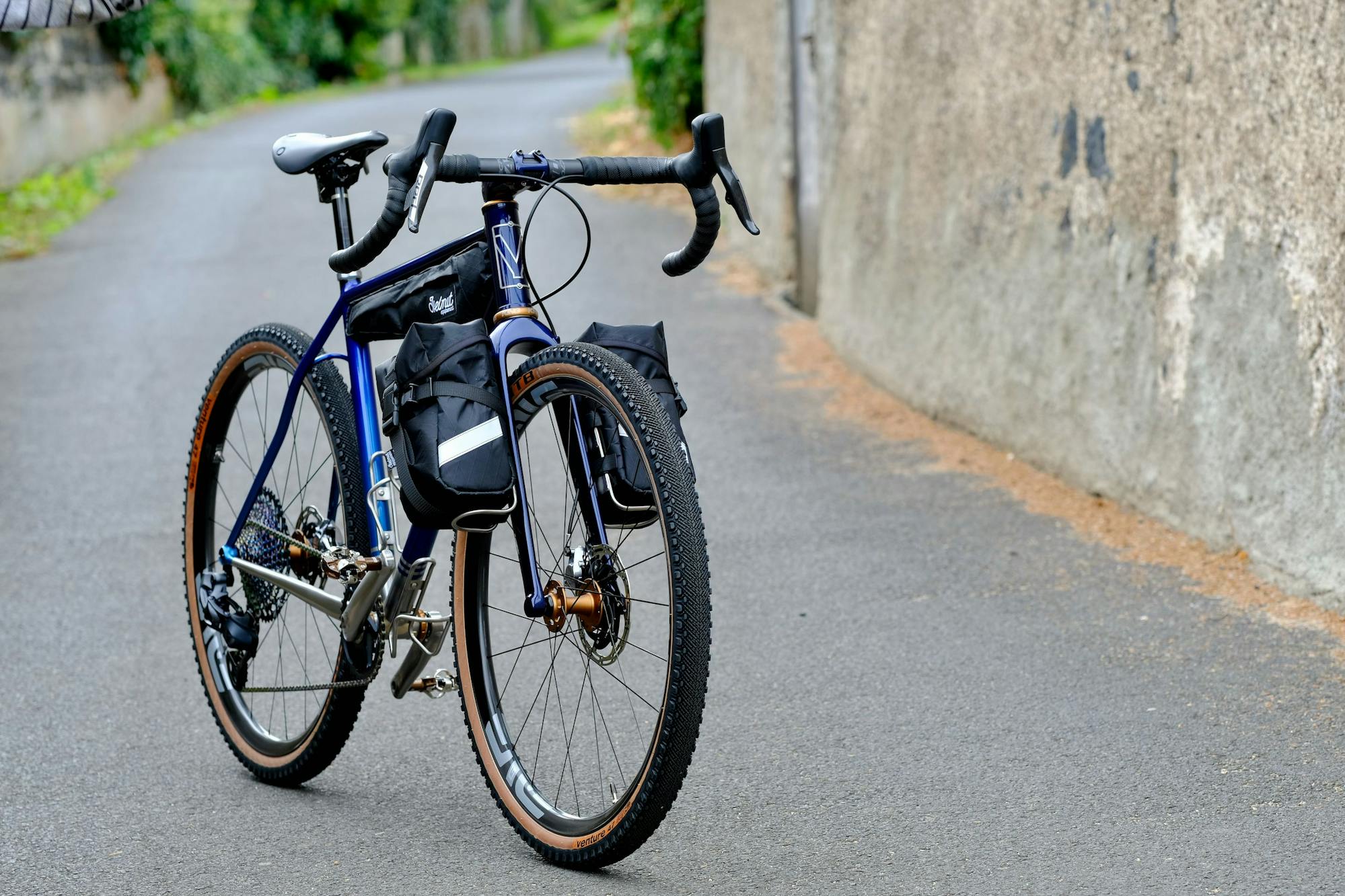 La fourche et le cadre présentent des fixations pour accueillir des bagages sur-mesures réalisés par Helmut équipement. La sacoche de cadre est directement vissée à l'intérieur du triangle avant, ce qui permet de se passer des sangles et de préserver la peinture.