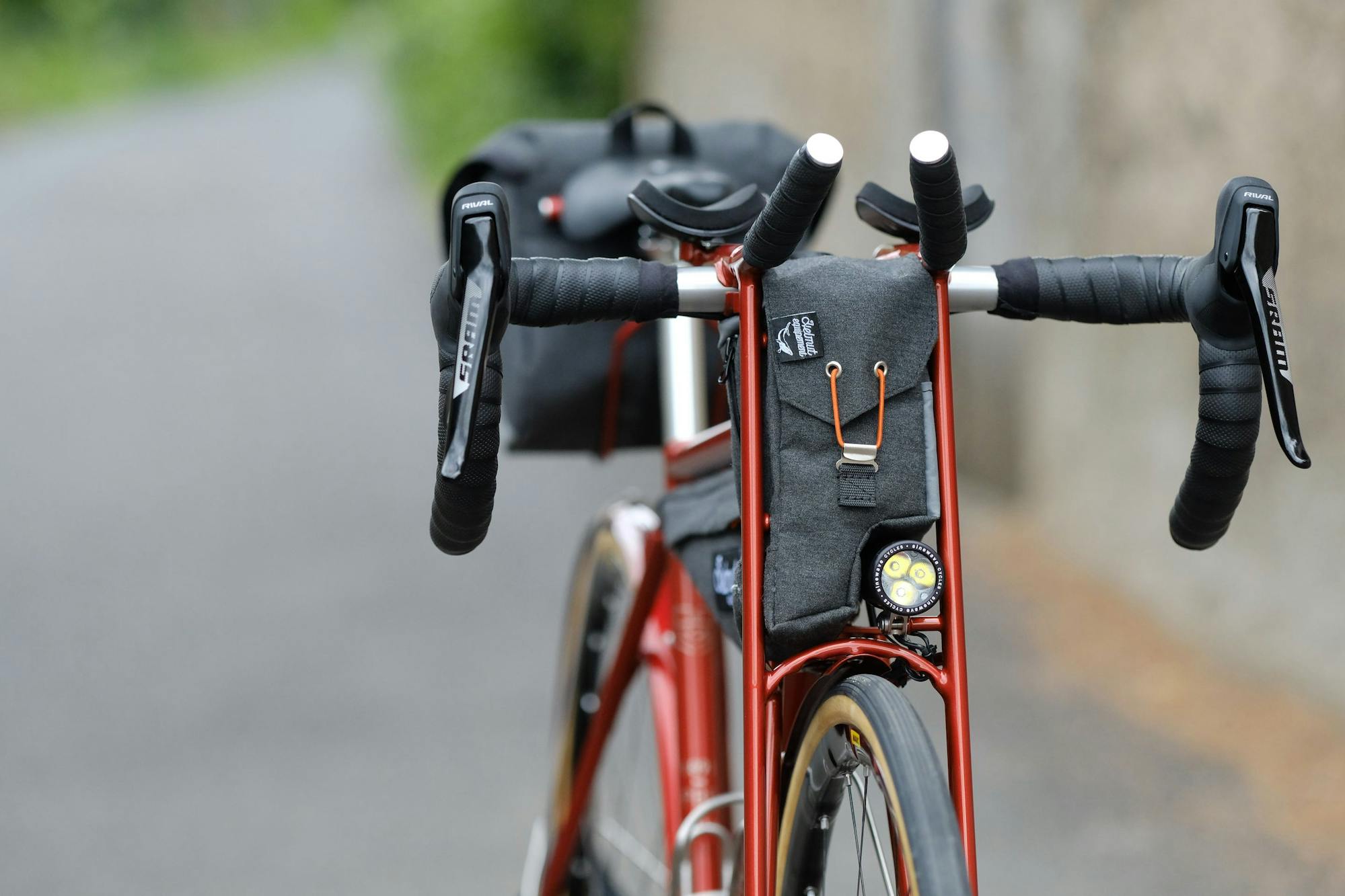 Le deuxième point concernait les problèmes d’engourdissement des mains suite aux 90h de rang à tenir le guidon. La solution classique est d’utiliser des prolongateurs de triathlon, rehaussés pour obtenir une position confortable, mais cette possibilité à l’inconvénient d’être peu esthétique et de rajouter du poids à l’ensemble du vélo. Notre réflexion part d’un constat simple : sur un vélo de longue distance moderne avec prolongateurs, l’avant est généralement très chargé visuellement, avec une multitude de tubes et des sacoches. Nous avons donc essayé de diminuer le nombre des tubes en leur attribuant un maximum de fonctions, selon le principe "less is more", cher à Ludwig Mies Van Der Rohe.