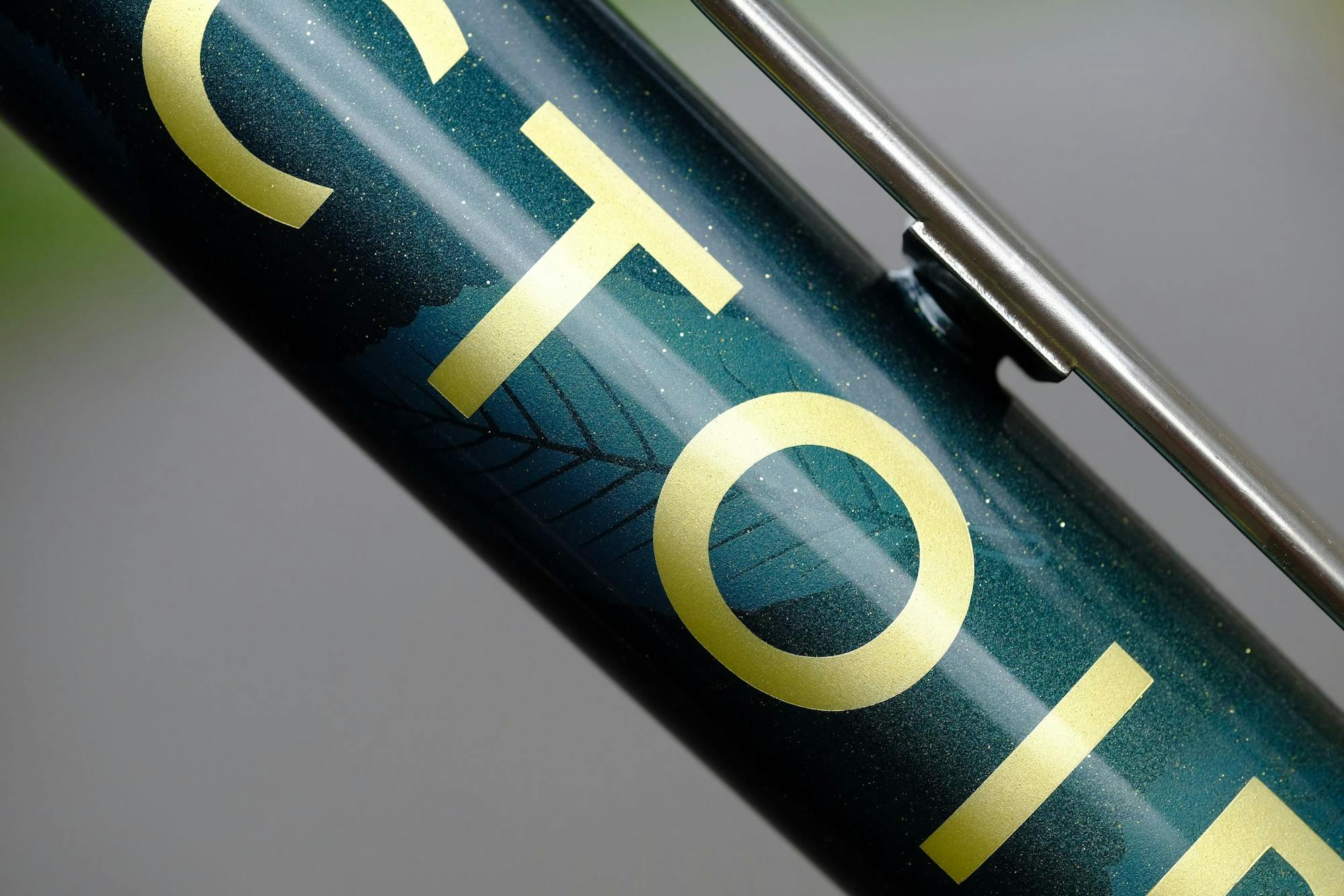 Une fois les feuilles peintes, une couche de vernis intermédiaire a été apposée pour fixer les feuilles, et rendre la peinture très résistante. Ce vernis a ensuite été dépoli pour accueillir les logos, dans le même doré que l'arrière du vélo, afin de créer une impression d'unité générale.