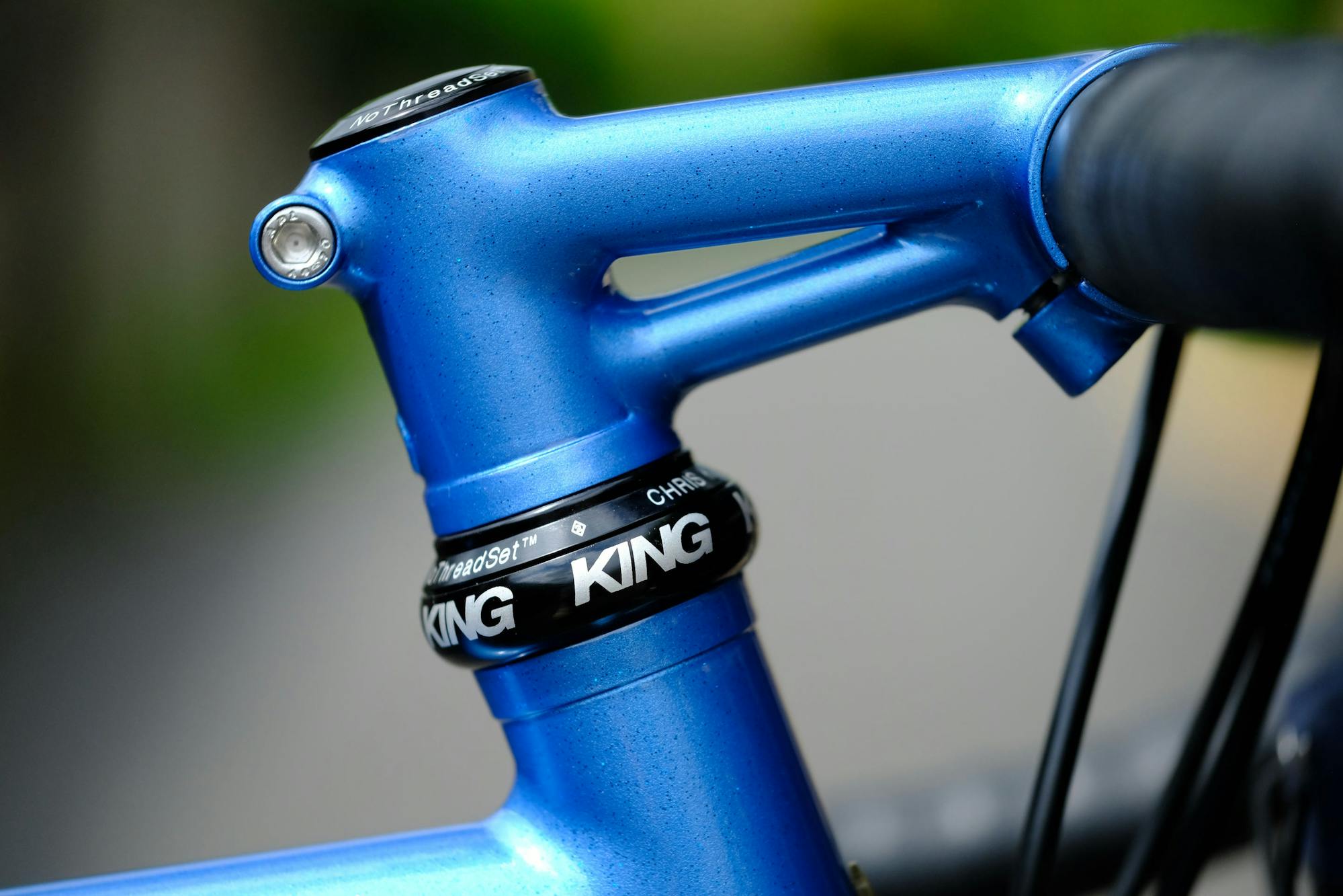La peinture a été réalisée dans notre cabine. Elle est composée de trois couleurs métallisées. Un bleu pastel est utilisé en dégradé avec un gris clair pour le cadre, tandis qu'un gris foncé a servi à réaliser les marquages du vélo. Les garde-boues, la potence et la fourche ont également été peints afin de créer un ensemble cohérent. Avant l'étape du vernis, un dégradé de paillettes a été déposé sur le cadre, avec des paillettes d'un bleu royal sur la partie bleue et des paillettes multicolores sur la partie grise. Cette opération renforce la réflection à la lumière et ajoute un niveau de détail supplémentaire.
